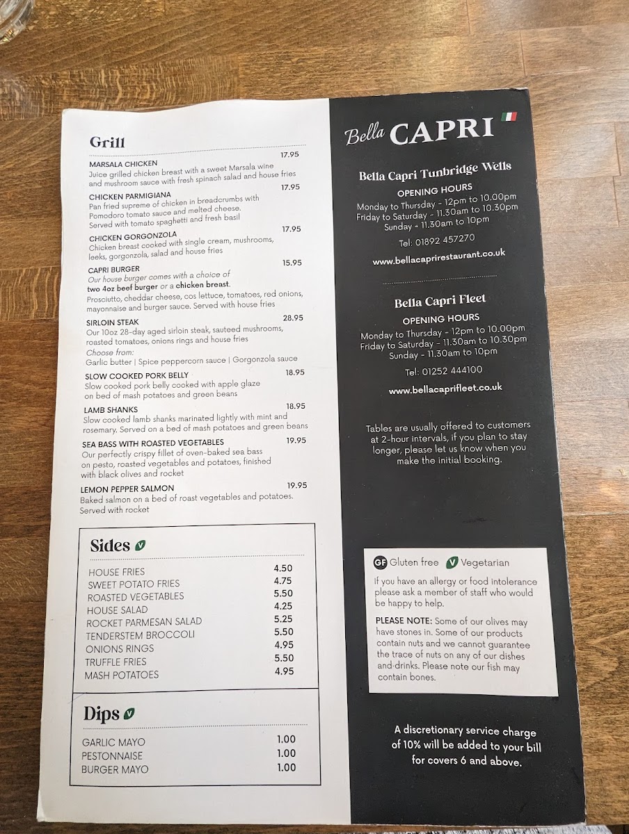 Compared to other Italian eateries in Tunbridge Wells, Bella Capri stands out for its authenticity, consistency, and attention to detail. It’s an excellent choice for both casual dinners and special occasions, particularly if you're seeking a true taste of Italy in a relaxed yet refined setting.